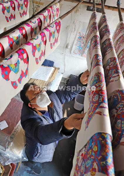 图片说明:2022年12月15日,在山东省潍坊市寒亭区杨家埠村,年画艺人们正在晾晒印制好的年画。