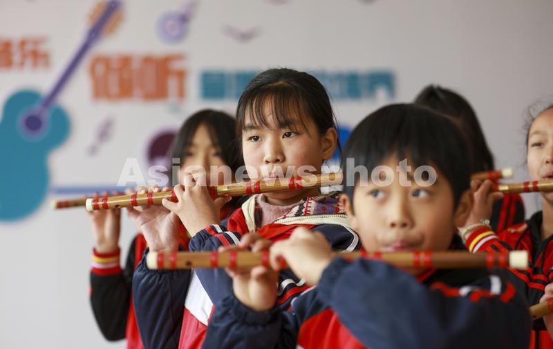 图片说明:2022年12月15日,贵州省黔西市中坪镇中坪小学的小学生利用课余时间进行笛子演奏练习。