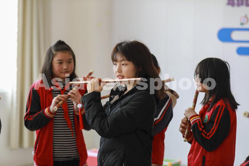 图片说明:2022年12月15日,老师在贵州省黔西市中坪镇中坪小学带领小学生练习笛子演奏。