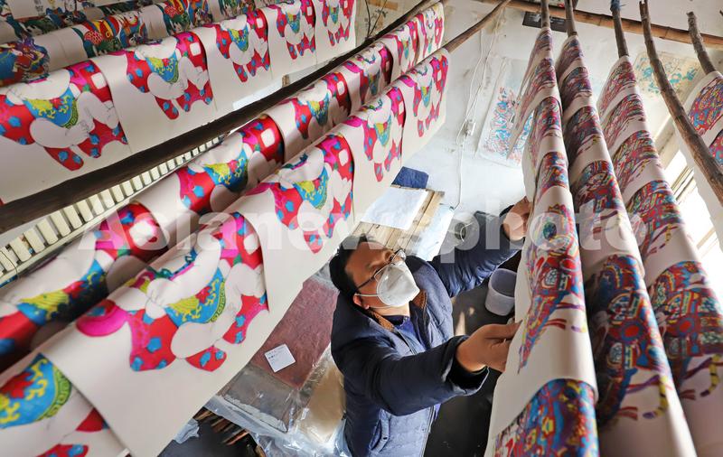 图片说明:2022年12月15日,在山东省潍坊市寒亭区杨家埠村,年画艺人们正在晾晒印制好的年画。