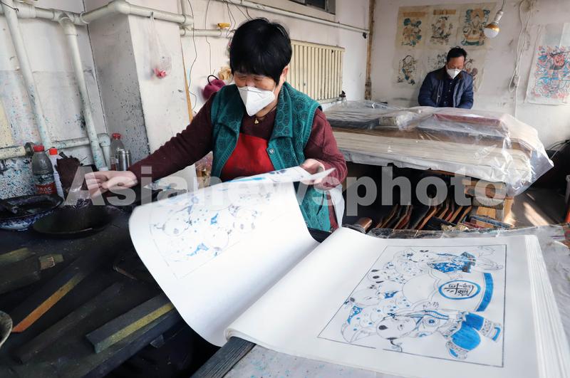 图片说明:2022年12月15日,在山东省潍坊市寒亭区杨家埠村,年画艺人们正在印制年画。
