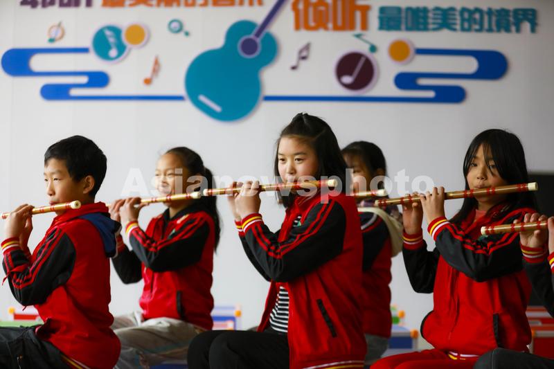 图片说明:2022年12月15日,贵州省黔西市中坪镇中坪小学的小学生利用课余时间进行笛子演奏练习。