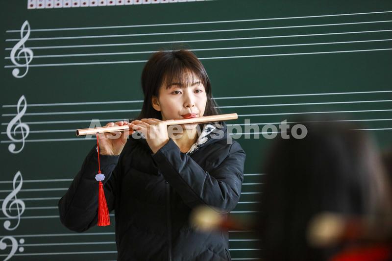图片说明:2022年12月15日,老师在贵州省黔西市中坪镇中坪小学给小学生示范笛子演奏。