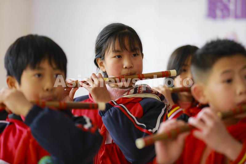 图片说明:2022年12月15日,贵州省黔西市中坪镇中坪小学的小学生利用课余时间进行笛子演奏练习。
