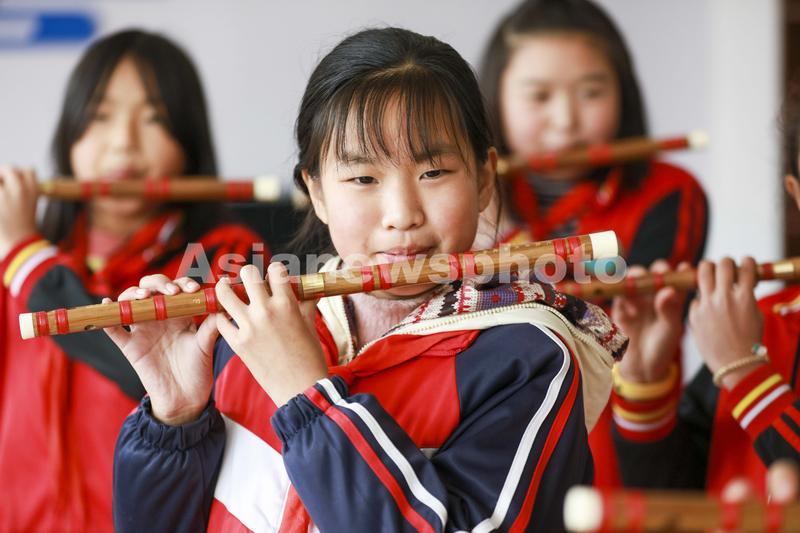 图片说明:2022年12月15日,贵州省黔西市中坪镇中坪小学的小学生利用课余时间进行笛子演奏练习。