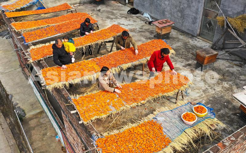 图片说明:2022年12月16日,湖南省永州市新田县枧头镇大观堡村,村民在晾晒红薯干。