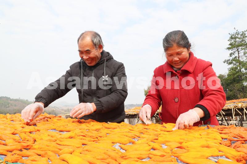 图片说明:2022年12月16日,湖南省永州市新田县枧头镇大观堡村,村民在晾晒红薯干。