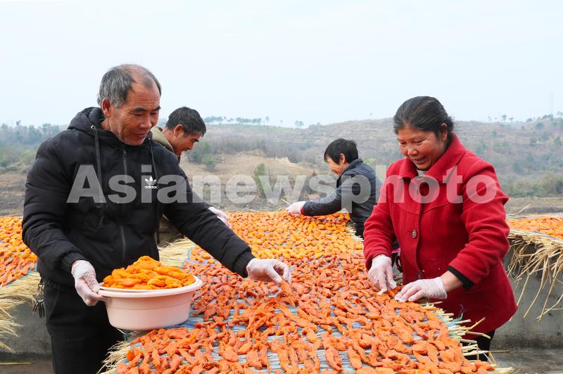 图片说明:2022年12月16日,湖南省永州市新田县枧头镇大观堡村,村民在晾晒红薯干。