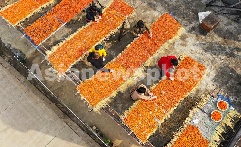 图片说明:2022年12月16日,湖南省永州市新田县枧头镇大观堡村,村民在晾晒红薯干。