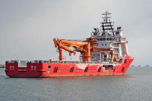 “德旭”轮隶属于交通运输部烟台打捞局,总长90.9米,型宽20米,配备DP2动力定位系统、两套200m³/h溢油回收能力的收油机以及起重能力100吨、作业水深1000米的深水起重机,具有3000m³的溢油存储能力和一级对外消防能力,可有效实施海上溢油回收、沉船存油抽取、难船存油过驳、应急抢险打捞等作业。