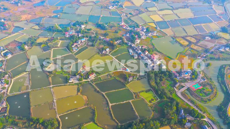 图片说明:2022年12月18日,重庆市梁平区礼让镇川西村,成片相连的鱼塘水光潋滟,与村落、田园、河流交相辉映,景美如画。
