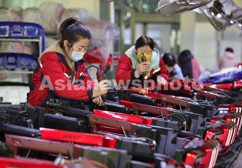 2022年12月26日,在位于河北省邢台市广宗县的贝多奇儿童玩具有限公司生产车间,工人在组装电动儿童玩具车。
