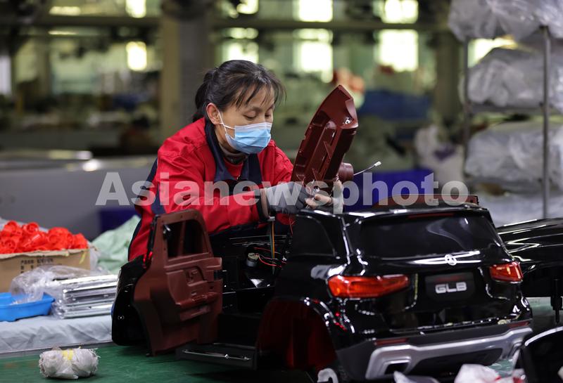 2022年12月26日,在位于河北省邢台市广宗县的贝多奇儿童玩具有限公司生产车间,工人在组装电动儿童玩具车。