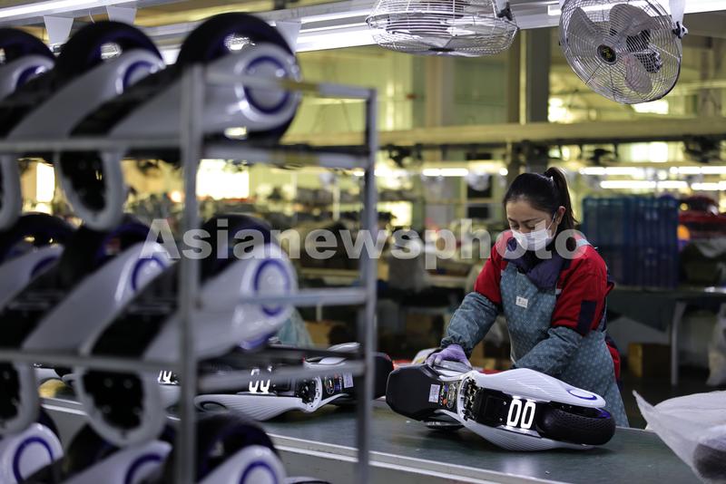 2022年12月26日,在位于河北省邢台市广宗县的贝多奇儿童玩具有限公司生产车间,工人在组装电动儿童玩具车。