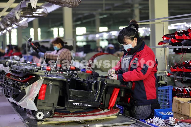 2022年12月26日,在位于河北省邢台市广宗县的贝多奇儿童玩具有限公司生产车间,工人在组装电动儿童玩具车。