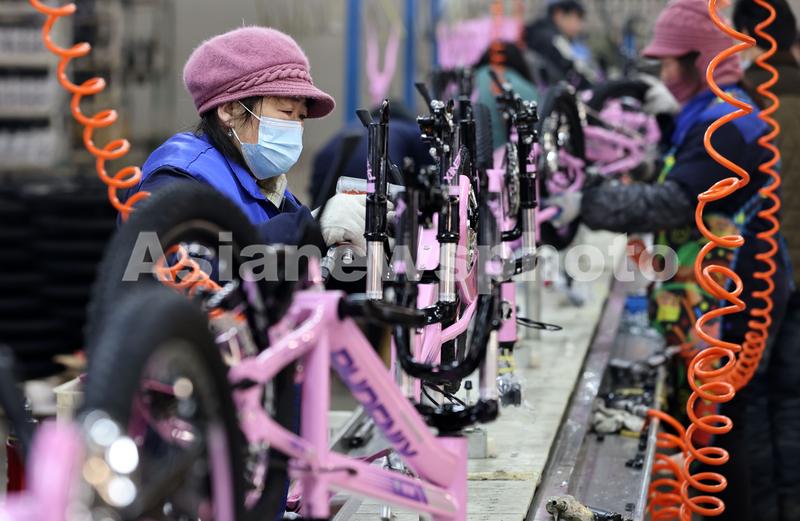 2022年12月26日,在位于河北省邢台市广宗县的天王自行车科技有限公司生产车间,工人在组装童车。