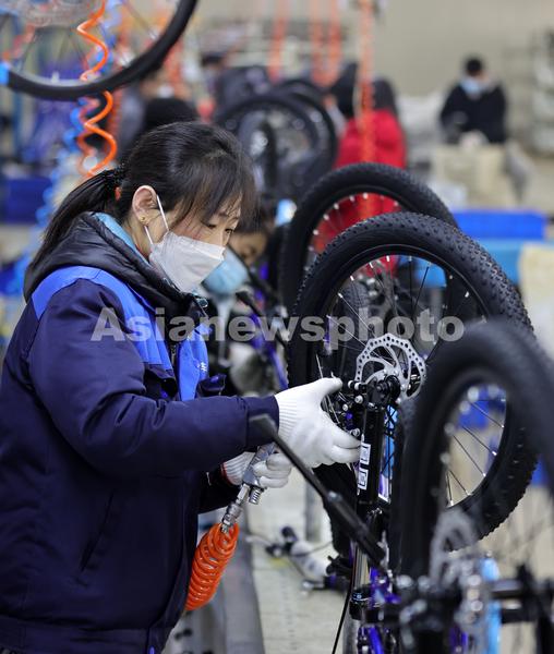 2022年12月26日,在位于河北省邢台市广宗县的天王自行车科技有限公司生产车间,工人在组装童车。