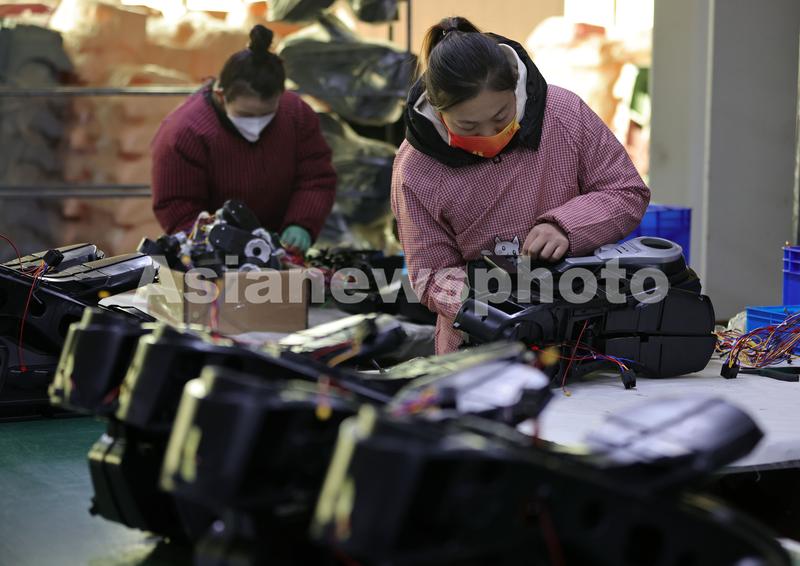 2022年12月26日,在位于河北省邢台市广宗县的贝多奇儿童玩具有限公司生产车间,工人在组装电动儿童玩具车。
