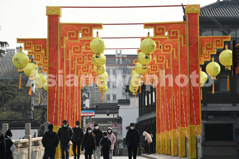图片说明:2022年12月27日,市民从在南京夫子庙景区花灯旁经过。