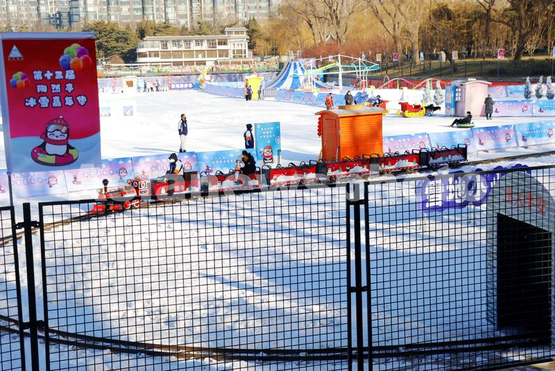 2022年12月28日,陶然亭公园冰雪嘉年华的雪地小火车。