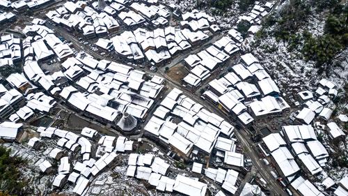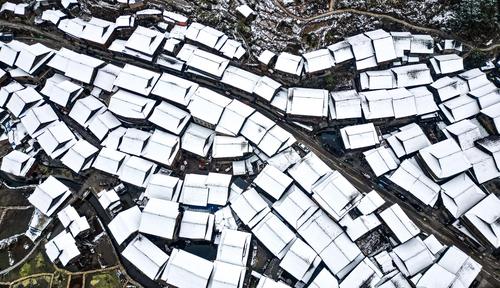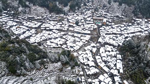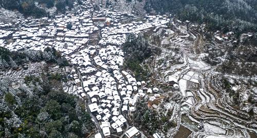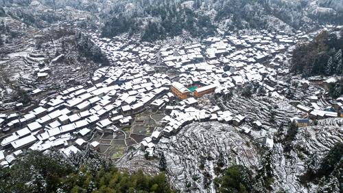 近日,贵州省黔东南苗族侗族自治州黎平县境内多地迎来降雪天气。雪后的侗寨里民房、鼓楼、梯田银装素裹,宛如一幅精致的画作,美不胜收。