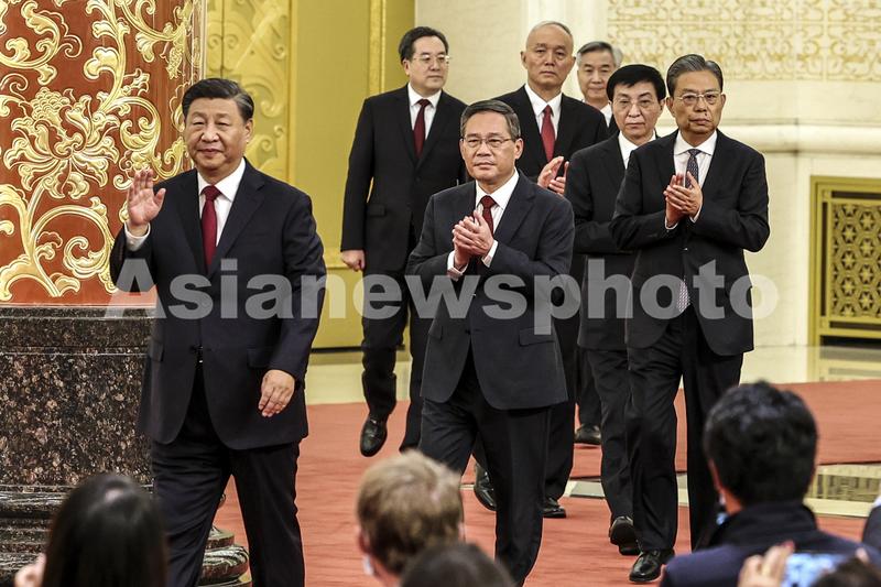2022年10月23日,在中国共产党第二十届中央委员会第一次全体会议上当选的中共中央总书记习近平和中共中央政治局常委李强、赵乐际、王沪宁、蔡奇、丁薛祥、李希在北京人民大会堂同采访中共二十大的中外记者亲切见面。这是习近平等在热烈的掌声中步入大厅。冯永斌/中国日报
