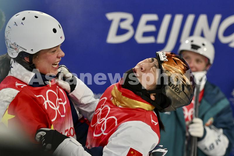 2022年2月14日,中国选手徐梦桃(右)与美国选手阿什莉·考德威尔相互拥抱。当日,北京2022年冬奥会自由式滑雪女子空中技巧决赛在张家口云顶滑雪公园举行,徐梦桃夺得冠军,这是中国女选手第一次在该项目中获得金牌。魏晓昊/中国日报