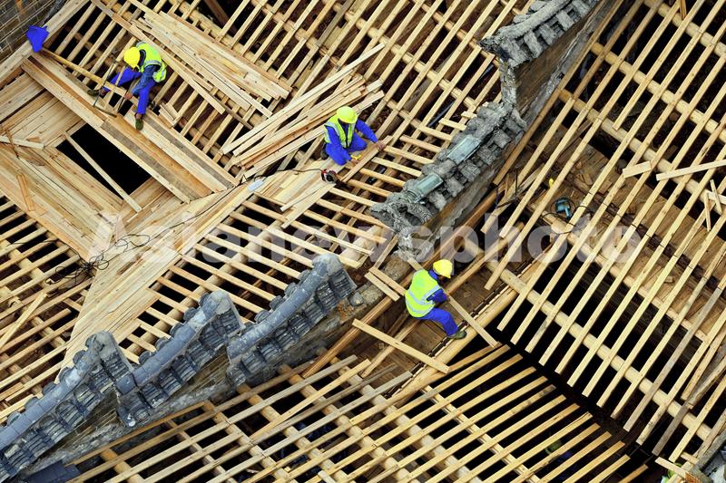 2022年3月21日,江西省赣州市南康区卢屋村,工人们在更换铺设古建筑瓦面支撑木。近年来,江西省赣州市南康区组织专业的古建筑修缮修复施工团队,对卢屋村占地面积4.96万平方米的赣派民居、宗祠、骑楼等古建筑群进行抢救性修缮,加大保护开发力度。朱海鹏/亚洲新闻图片网