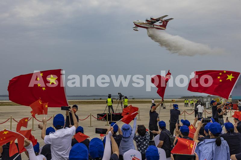 2022年9月27日,湖北荆门,观众观看“鲲龙”AG600M灭火机进行投汲水试验。当日,由我国自主研制的“鲲龙”AG600M灭火机以全新消防涂装在荆门漳河机场成功完成12吨投汲水试验,并签署首批6架机购机协议,标志着该型飞机迈出了市场化开拓和实战化应用的关键一步。沈玲/亚洲新闻图片网