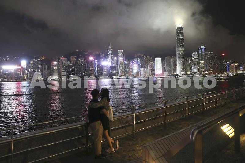 2022年6月6日,香港,一对情侣欣赏维多利亚港夜景。2022年是香港回归祖国25周年,在祖国全力支持下,香港经济蓬勃发展,国际金融、航运、贸易中心地位稳固,创新科技产业迅速兴起。邹红/中国日报
