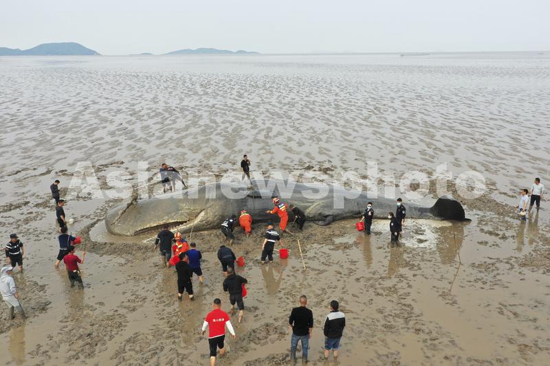 2022年4月19日,浙江宁波,救援人员在对一头搁浅的抹香鲸施救。20日5时20分左右,经过20多小时的艰难救援,这头体长近20米的搁浅抹香鲸终于重新回到大海的怀抱,这是近年来国内少数成功开展的鲸类搁浅救援行动。张培坚/亚洲新闻图片网