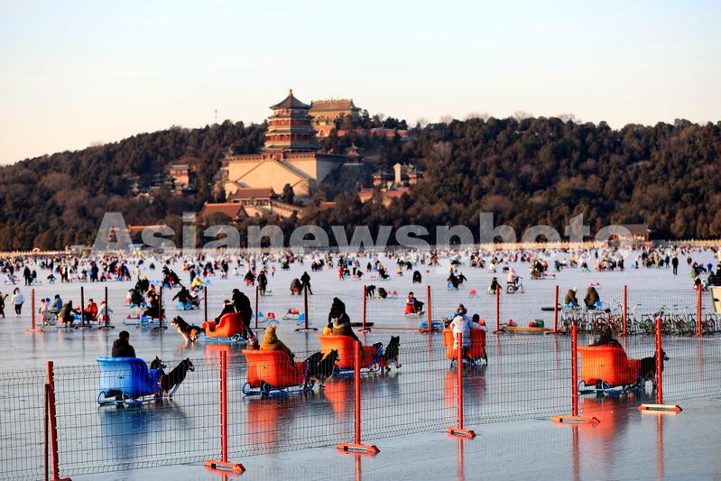 图片说明:2023年1月1日,市民在颐和园昆明湖冰场体验各种滑冰娱乐项目。
