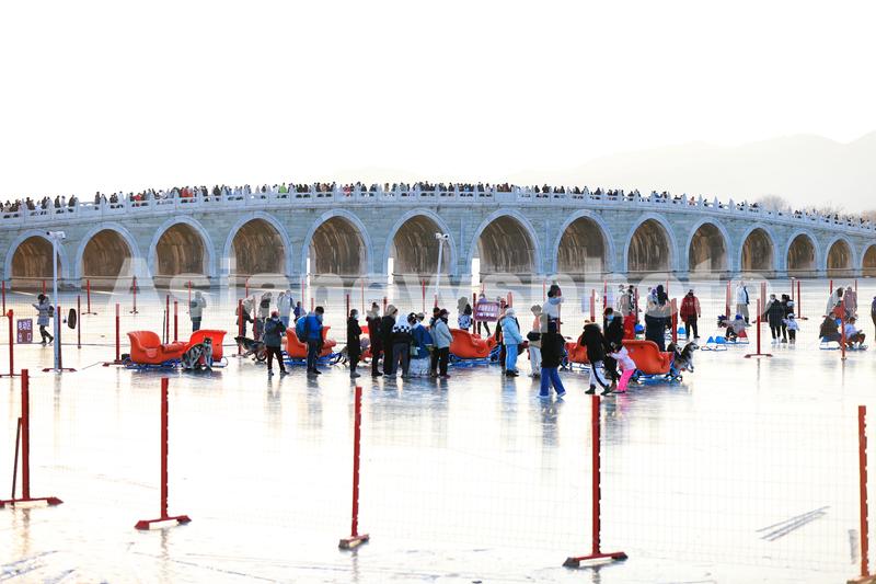 图片说明:2023年1月1日,市民在颐和园昆明湖冰场体验各种滑冰娱乐项目。