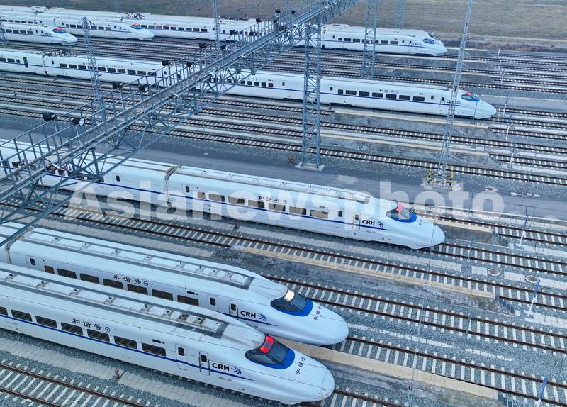 2023年1月1日清晨,在江苏省南通市崇川区幸福街道拍摄的南通动车所存车线上排列的动车组。