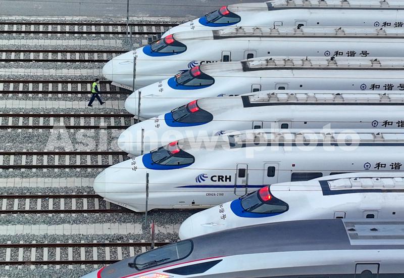 2023年1月1日,工作人员在江苏南通动车所存车线上动车组前走过,准备上岗。
