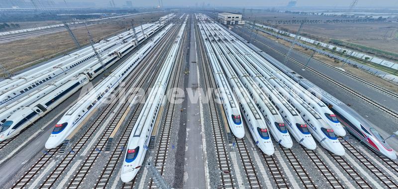2023年1月1日拍摄的位于江苏省南通市崇川区幸福街道辖区的南通动车所存车线上排列的动车组。当天,南通动车所上线运行动车组14列17组,助力长三角铁路元旦小长假运输。