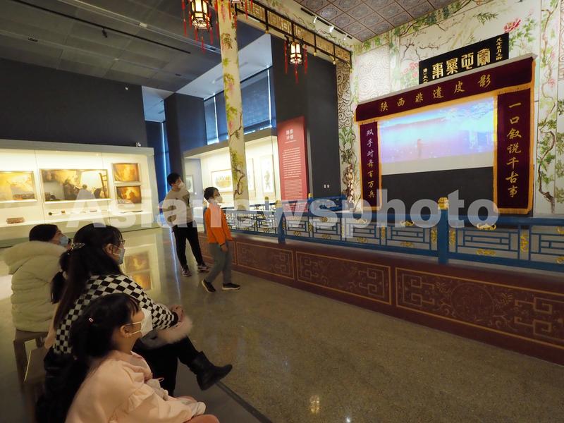 2023年1月2日,观众在中国工艺美术馆、中国非物质文化遗产馆“影戏人间:陕西非遗皮影展”上观看皮影表演。