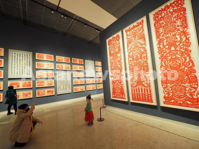 2023年1月2日,观众在中国工艺美术馆、中国非物质文化遗产馆内参观“太行之魂——张永忠剪纸艺术作品捐赠展”。