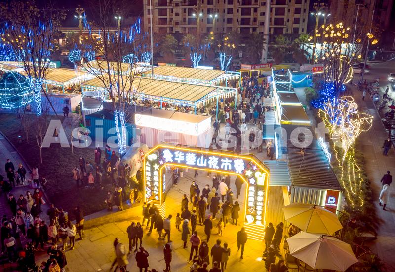 2022年12月31日晚,四川省华蓥市络绎不绝的市民走进向灯火辉煌的“华蓥山夜市”(无人机照片)。