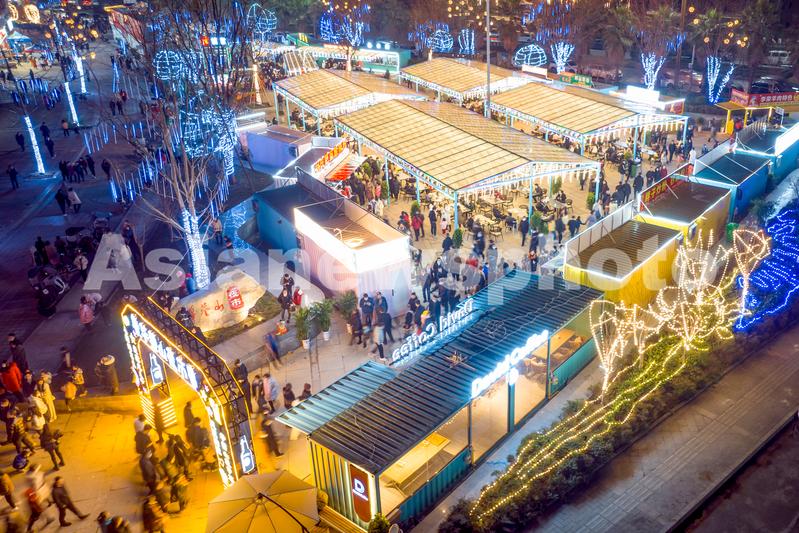 2022年12月31日晚,四川省华蓥市络绎不绝的市民走进向灯火辉煌的“华蓥山夜市”(无人机照片)。