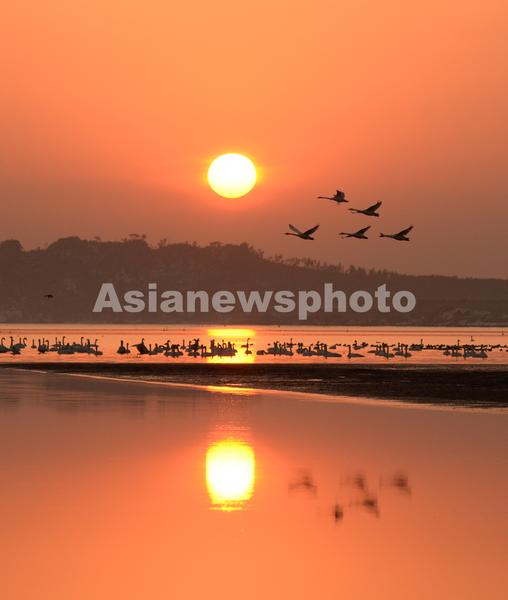 图片说明:2023年1月1日清晨,大天鹅在山东省荣成市天鹅湖畔迎着灿烂的朝阳飞翔。