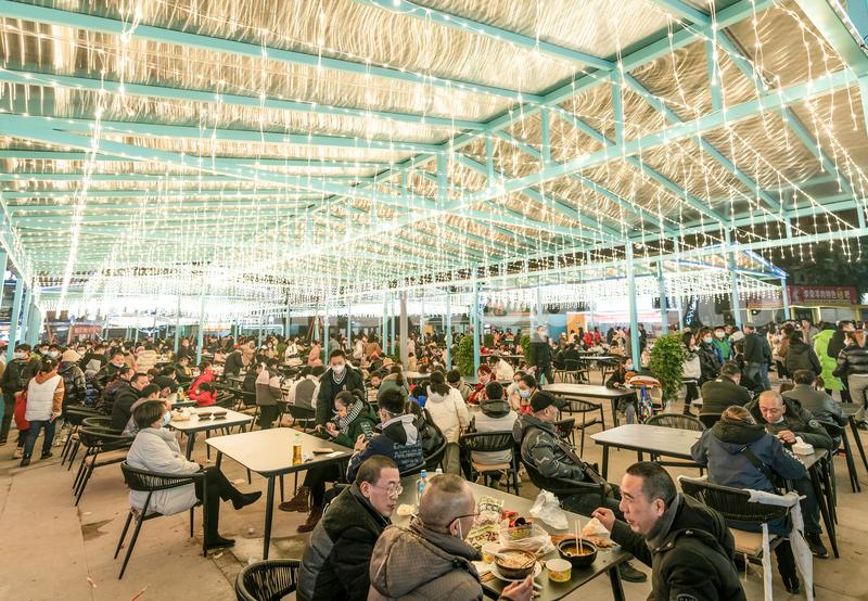 2022年12月31日晚,四川省华蓥市如织的市民在灯火辉煌的“华蓥山夜市”品尝特色食物和玩耍。