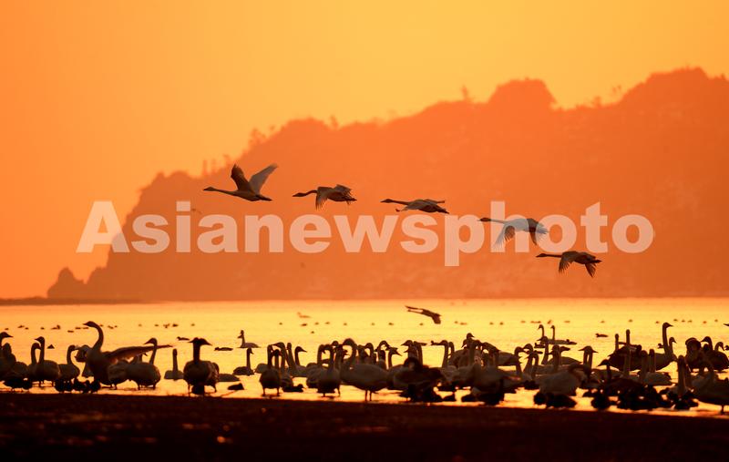 图片说明:2023年1月1日清晨,大天鹅在山东省荣成市天鹅湖畔迎着灿烂的朝阳飞翔。