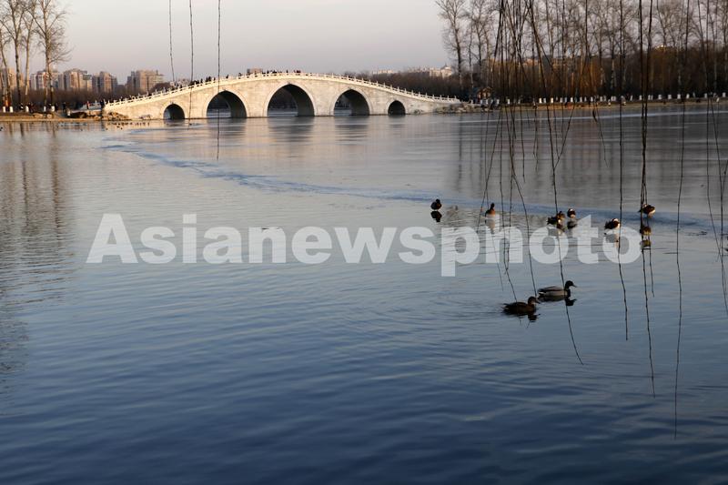 2023年1月1日,北京玉渊潭公园内的鸳鸯、绿头鸭等水鸟在冬日暖阳中嬉戏觅食。