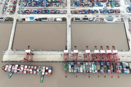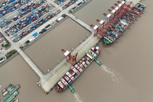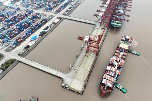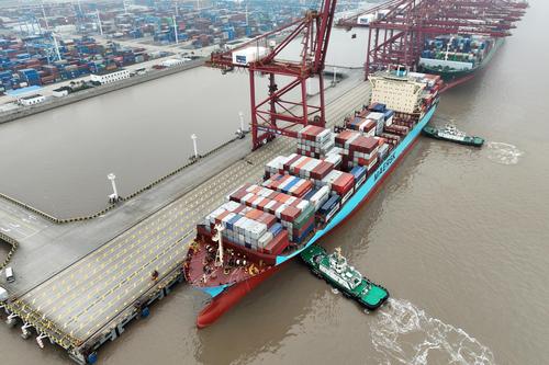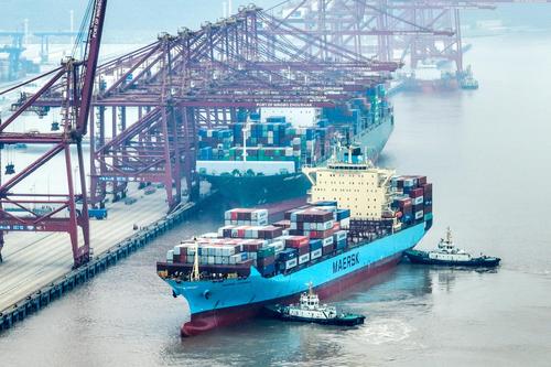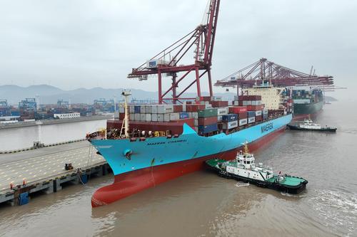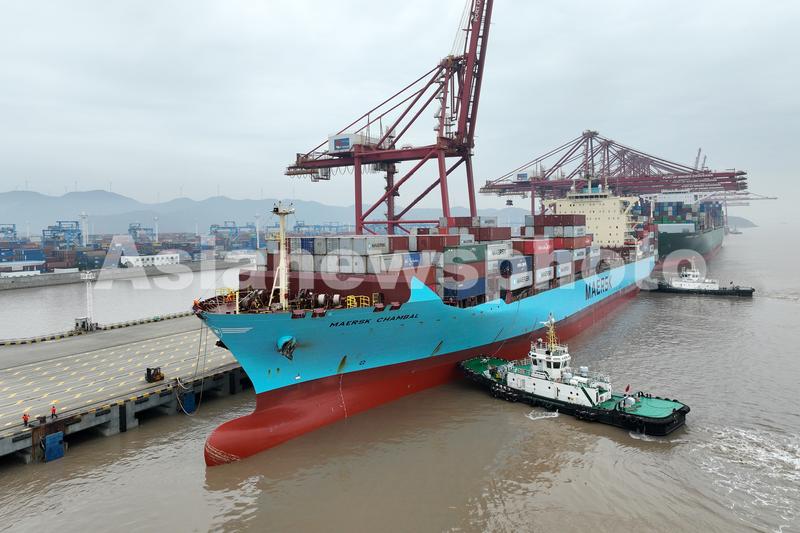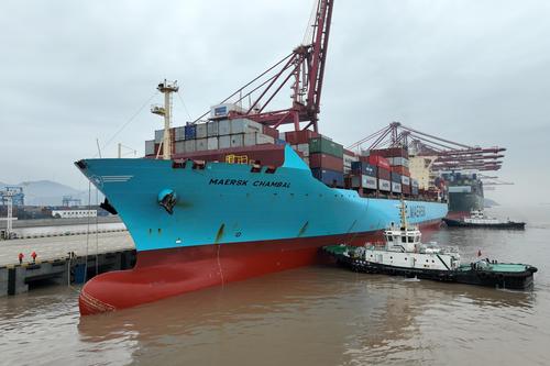 图片说明:2023年1月5日上午,中国香港籍马士基昌巴尔(MAERSK CHAMBAL)轮靠泊宁波舟山港金塘港区大浦口码头1号泊位,计划在港装卸2390标箱,并装载小家电、机械配件等货物驶往 “一带一路”沿线国家。
