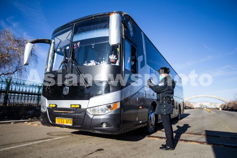 图片说明:2023年1月8日,二连出入境边防检查站执勤民警检查验放国际客运班车。