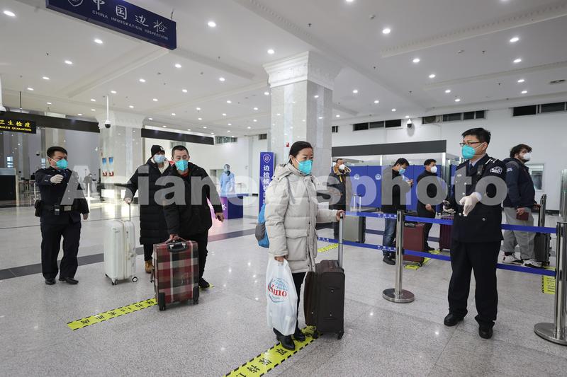满洲里边检站移民管理警察引导旅客接受边防检查。卢兵兵 摄