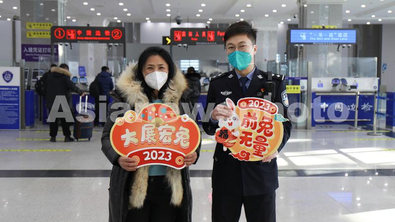 满洲里边检站移民管理警察向入境旅客致以新年问候。安吉拉 摄