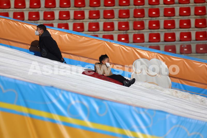图片说明:1月8日,小朋友在北京首钢滑雪大跳台体验“雪圈冲浪”项目。