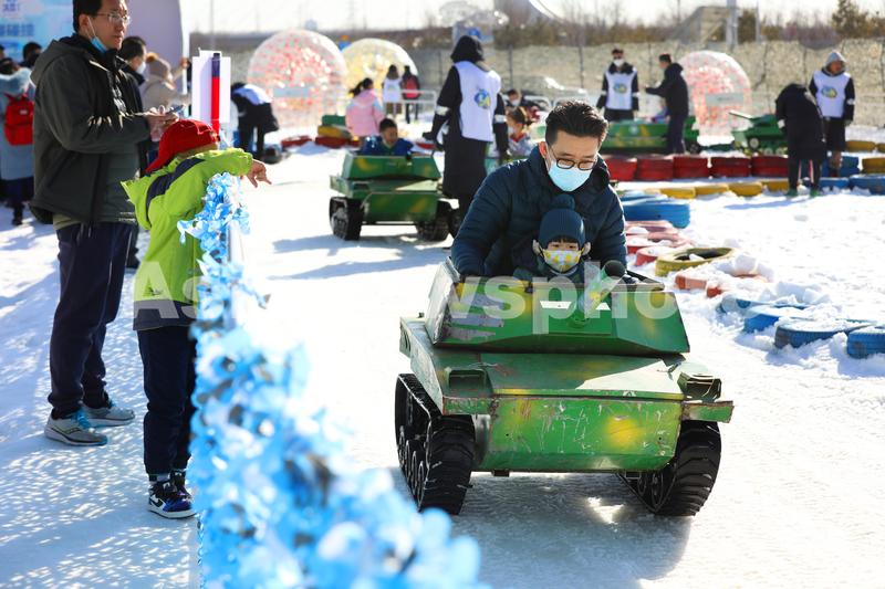 图片说明:1月8日,在北京首钢滑雪大跳台,小朋友和家长乘坐雪地坦克体验冰雪乐趣。